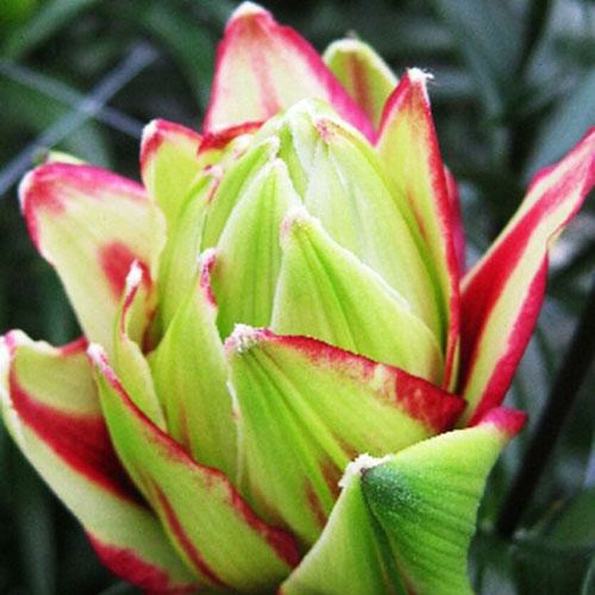 У рассматриваемого сорта стебли высотой 80 – 100 см. Они прочные и крепкие, поэтому не требуют подвязки. В середине лета на них образуются потрясающие махровые бутоны. Лепестки и чашелистики собраны в аккуратное соцветие. Диаметр полностью распустившегося цветка равен 10 – 15 см. Окрашен он в светло-зеленый цвет с потрясающими красными мазками. Бутоны «смотрят» в сторону или вверх и сохраняют декоративный вид до 6 – 12 дней. Период цветения длится с июля по август.