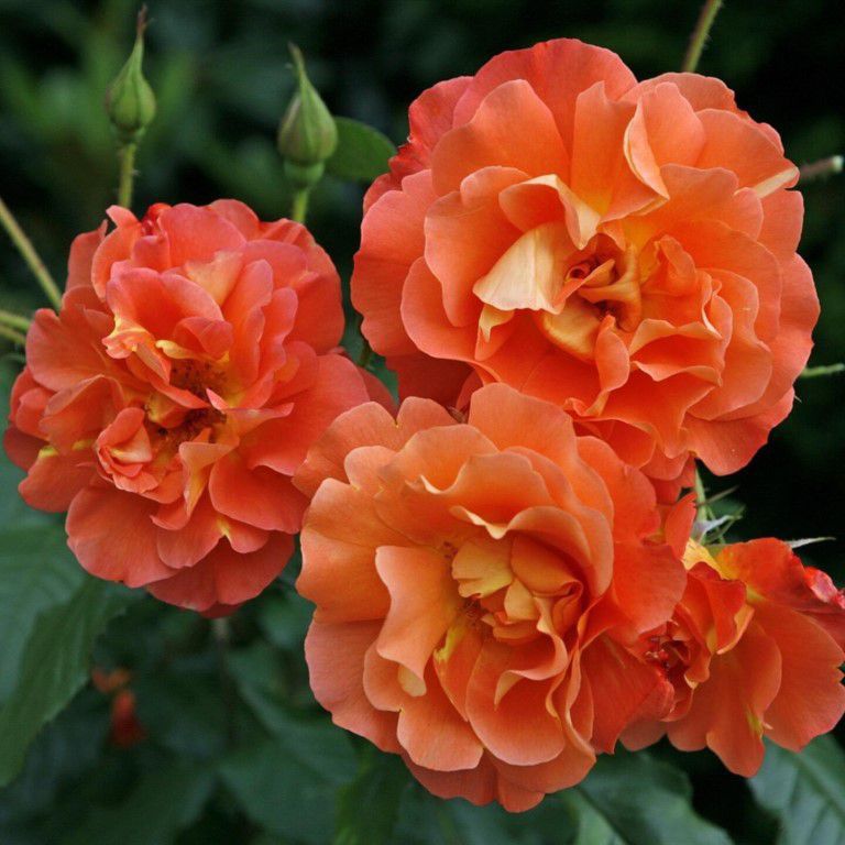 Куст вырастает довольно внушительных размеров: диаметром 1,5 м и высотой 1,6 – 2 м. Тем не менее, он не занимает много места на участке. На побегах образуются полумахровые цветки, состоящие из множества волнистых лепестков. Обычно они собраны в соцветия по 5 – 10 штук. Окрас у бутонов ярко-оранжевый, но постепенно он приобретает другие оттенки. В пасмурную погоду лепестки украшает насыщенно-розовый подтон. Сердцевинка – желтая. Аромат приятный и выразительный.